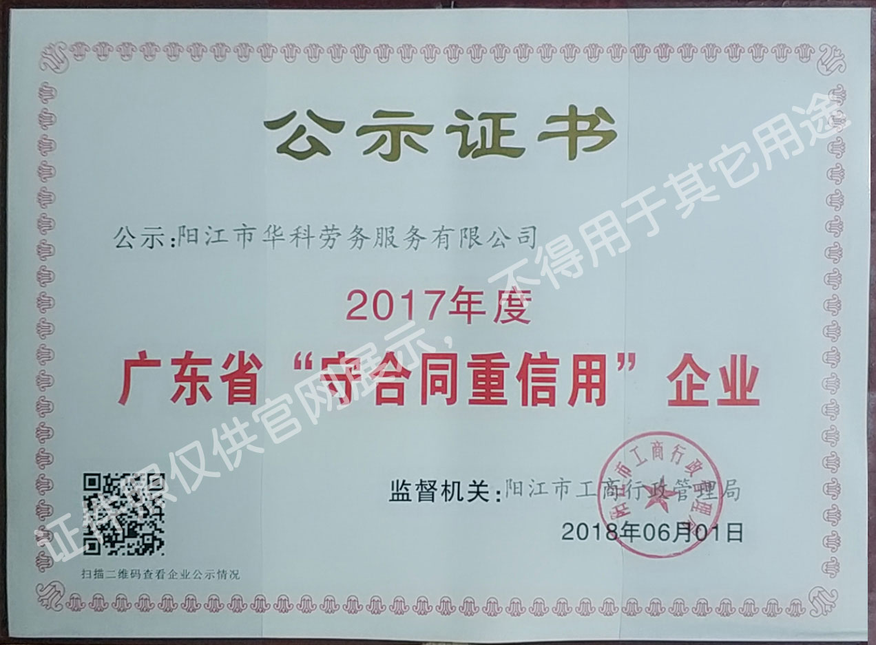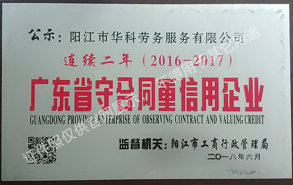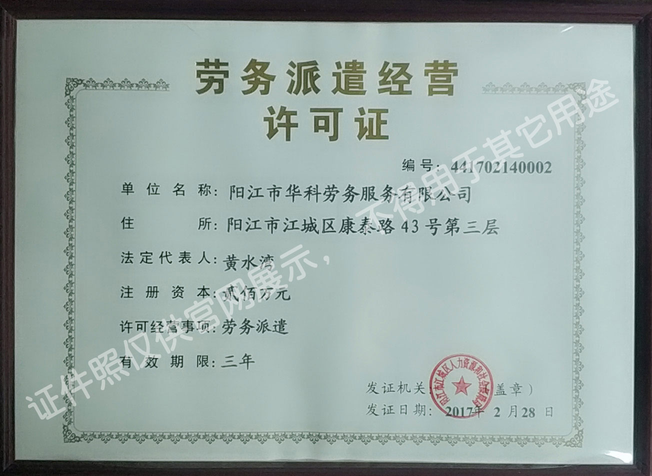 華科勞務(wù)服務(wù)有限公司是專業(yè)從事人事代理、勞務(wù)租賃、人力派遣及管理的綜合性服務(wù)機構(gòu),是首批獲得廣東省人力資源廳、陽江市勞動和社會保障局頒發(fā)人力資源許可證的合法單位。公司秉承“誠信務(wù)實、專業(yè)熱情、滿意第一、服務(wù)社群”的經(jīng)營理念,在勞務(wù)派遣業(yè)務(wù)的基礎(chǔ)上,更致力于合同制工人(臨時工、實習(xí)生、假期工)方向發(fā)展,為用工企業(yè)及時輸送合格的各類人才,合理調(diào)配人力資源的有序流動,幫助求職者尋求更加滿意的就業(yè)渠道和崗位,切實維護求職者的合法權(quán)益。